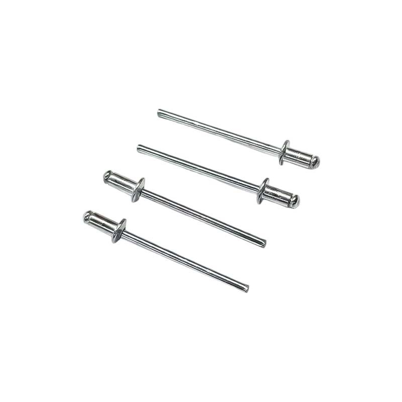 Der Kernzugniet mit hoher Klemme hat ein einfaches zweiteiliges Design: einen hohlen, rohrförmigen Körper mit einem dünnen Stift (Dorn), der durch die Mitte verläuft. Das auffälligste Merkmal von Kernziehnieten ist der Flanschkopf an einem Ende, der beim Einsetzen flach am Material anliegt.